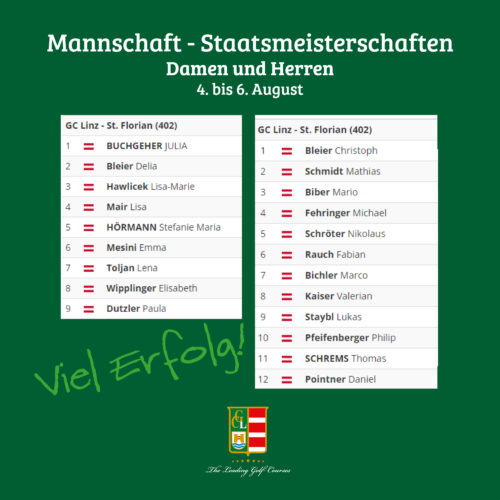 Von 04.08.2023 bis 06.08.2023 fanden am GC Salzkammergut die Österreichischen Mannschaftsmeisterschaften DIV 1 der Damen und Herrn statt. Die Meisterschaften standen wetterbedingt leider unter keinem guten Stern. Aufgrund der Regenfälle musste schon die Proberunde abgesagt werden und wurde das Programm dahingehen geändert, dass die Herren am Freitag zwei Runden spielen mussten und die Damen eine Runde.